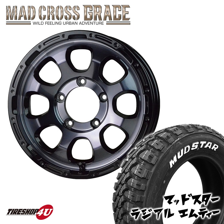 MAD CROSS GRACE 16x5.5J 5/139.7 +20 BKCBK MUDSTAR RADIAL M/T 205/80R16 104T WL ホワイトレター ジムニー JB64 新品 タイヤ&アルミホイール4本セット