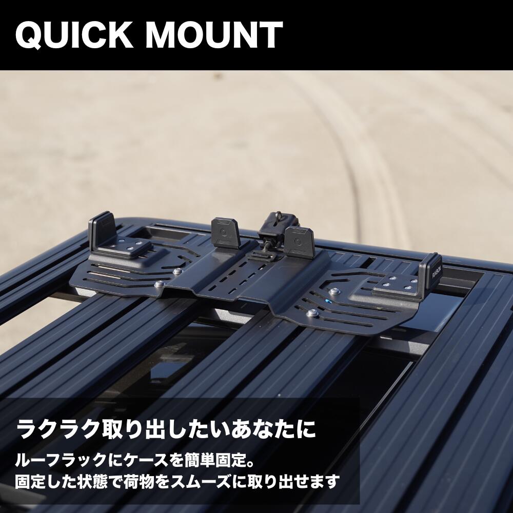 専用の「クイックマウントシステム」を使えば、ラックへの固定や取り外しが数秒で完了。ストラップで固定する煩わしさを解消し、目的地に到着後すぐに行動できる、現代のオーバーランドや4x4カスタムに相応しいスマートな積載を実現します。